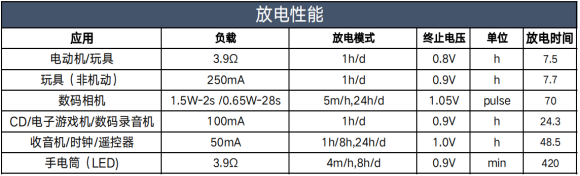 開路電壓 1.5-1.68V 3.9Ω放電時間* 7.2h